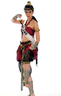 Negara Asia memang dikenal sebagai gudangnya ilmu bela diri. Mulai dari kungfu, karate, tae kwon do, thai boxing, silat, aikido, judo, dsb yang kalau disebutin satu -satu ngga bakalan selesai. Oleh karena itu pada pemilihan Miss Universe 2008 kontestan dari beberapa negara Asia mengenakan kostum beladiri mereka sebagai kostum tradisional untuk penilaian. Dan hasilnya Miss Thailand memenangkan event ini untuk kategori Traditional Costume. Lihat aja sendiri aksi mereka dalam kostum tradisional beladiri mereka. Ciiiaaaaaaaaattttttt